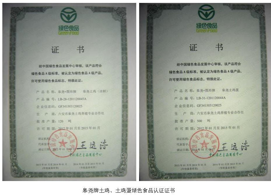 2011年12月20日,六安市皋尧土鸡养殖专业合作社皋尧牌土鸡、土鸡蛋通过农业部绿色食品发展中心专家评审,获得绿色食品认证。六安市皋尧土鸡养殖专业合作社在2010年3月开始向农业部绿色食品发展中心申报皋尧牌土鸡、土鸡蛋绿色食品认证。在申报过程中,在区、市、省和农业部相关部门领导、专家的指导下,对存在的问题进行不断改进,严格按照绿色食品生产要求组织生产,最终获得了评审专家的认可,顺利通过绿色食品认证。合作社将以此为契机,加大皋尧牌土鸡、土鸡蛋的品牌推广力度,加快皋尧土鸡产业的健康快速发展。